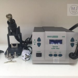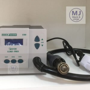 A Quick 861DW é uma estação de ar quente com uma alta potência de 1000 watts e tem um fluxo de ar máximo de 120 litros por minuto, este dispositivo foi projetado para soldar componentes SMD, como SOIC, QFP, PLCC, CHIP e BGA. Além disso, a Quick 861DW também é adequado para secagem, remoção de tinta, fusão, aquecimento e desinfecção de superfícies, devido à alta potência e ao elemento de aquecimento de cerâmica, é possível um rápido aquecimento até a temperatura desejada. A Esd 861DW possui três canais CH1 – CH2 – CH3, onde a temperatura e a quantidade de fluxo de ar podem ser definidas e essas configurações podem ser memorizadas pelo dispositivo.